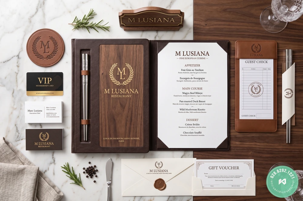 M Lusiana mang đậm nét sang trọng cổ điển của ẩm thực Pháp. Điểm nhấn của bộ nhận diện này là cuốn menu bìa gỗ phối gáy da cực kỳ cao cấp, đi kèm với kẹp bill (guest check) bọc da đồng bộ. Từng chi tiết nhỏ trên bàn ăn như lót ly da dập chìm logo, bảng tên để bàn bằng gỗ khắc laser hay bao đũa giấy trắng tinh tế đều toát lên vẻ đẳng cấp. Bên cạnh đó, các ấn phẩm như thẻ VIP Membership ép kim, namecard nhà hàng, gift voucher và bao thư cũng được thiết kế chuẩn nhận diện, đồng nhất tone nâu trầm sang trọng.