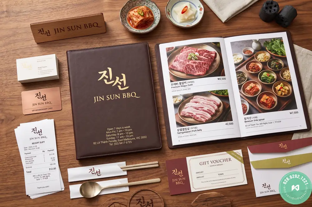 Với bộ nhận diện thương hiệu nhà hàng TPHCM của Jin Sun BBQ, Khải Nguyên sử dụng tone nâu sẫm kết hợp chữ Hàn Quốc ép kim vàng gold, tạo không gian ấm cúng đúng chuẩn quán nướng truyền thống. Bộ sản phẩm nổi bật với cuốn menu bìa da dập logo sắc nét. Hệ thống vật dụng bàn ăn được chăm chút kỹ lưỡng qua bảng tên gỗ để bàn, lót ly gỗ khắc laser và bao đũa muỗng giấy. Khách hàng cũng được trải nghiệm sự chuyên nghiệp qua thẻ VIP nhựa, phiếu tính tiền, bao thư, gift voucher và namecard được thiết kế liền mạch với tổng thể.