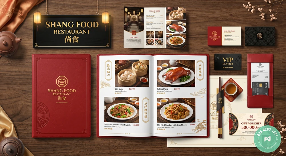 Thể hiện tinh thần ẩm thực Trung Hoa thịnh vượng, Shang Food gây ấn tượng mạnh với sắc đỏ rực rỡ và họa tiết cung đình. Chúng tôi đã triển khai đồng bộ từ bảng hiệu gỗ đen chữ vàng quyền lực, đến cuốn menu bìa da đỏ ép kim lấp lánh và kẹp bill cùng tone. Các ấn phẩm marketing và phục vụ như thẻ VIP nhựa đen tuyền, lót ly, bao đũa, brochure gấp 3, namecard cùng gift voucher 500.000đ đều mang đậm dấu ấn Á Đông, thu hút ngay từ ánh nhìn đầu tiên.