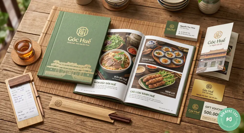 Vật phẩm Marketing & Chăm sóc khách hàng: Thẻ VIP, thẻ tích điểm, túi giấy, hộp đựng đồ mang về (take-away), brochure giới thiệu. Đặc biệt, đừng bỏ qua các mẫu in voucher nhà hàng để thúc đẩy doanh số.
