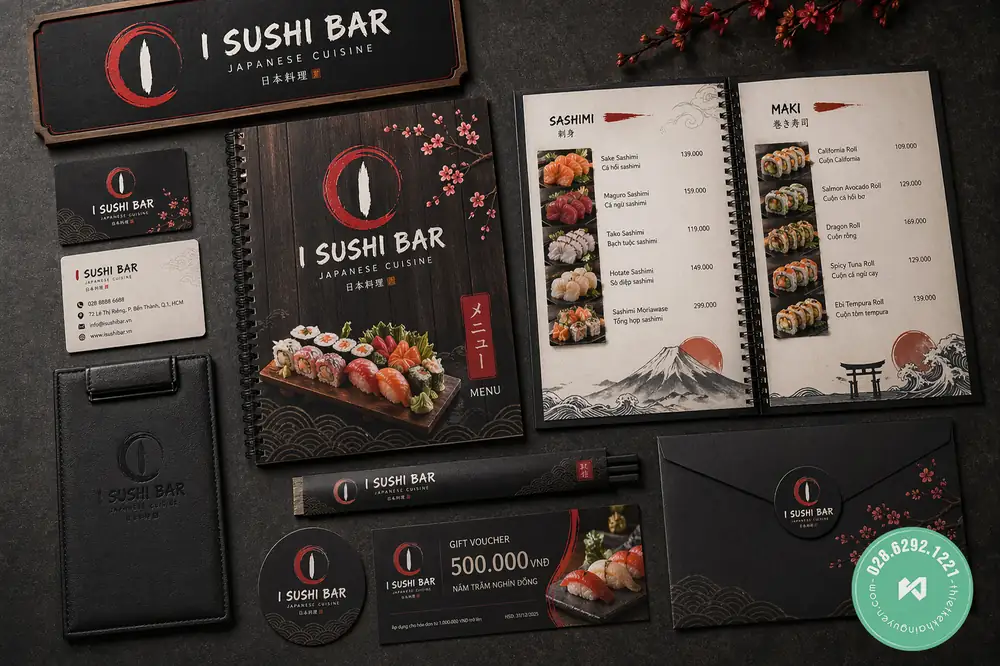 Phá cách với phong cách Nhật Bản hiện đại, I Sushi Bar chọn tone đen – đỏ cá tính cùng họa tiết cọ vẽ (brush) dứt khoát. Bộ ấn phẩm bao gồm menu bìa cứng đóng gáy lò xo tiện dụng, kẹp bill bìa da đen nhám và bảng hiệu nhỏ gọn. Sự đồng bộ còn thể hiện qua lót ly tròn tối màu, bao đũa, bao thư đen nắp chữ V độc đáo, namecard và gift voucher, tạo nên một tổng thể vô cùng ấn tượng nhưng vẫn giữ được nét đặc trưng của văn hóa Nhật.