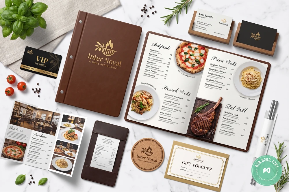 Dịch vụ cung cấp: Thiết kế và in ấn trọn gói bộ nhận diện thương hiệu nhà hàng (Brand Identity).
