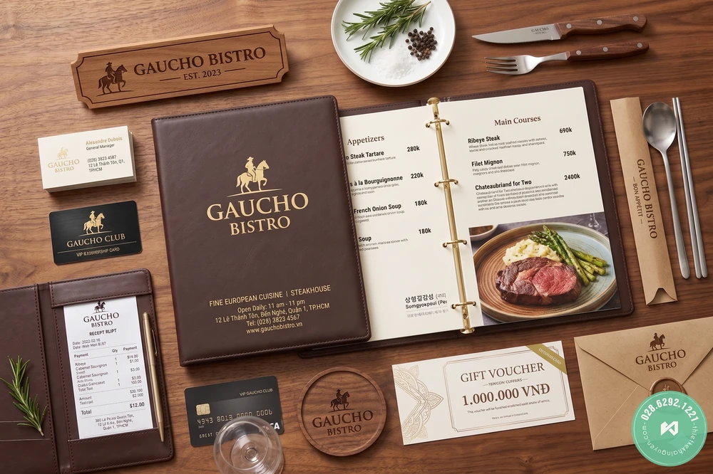Bao gồm: Quy chuẩn Logo đồng bộ, hệ thống Menu phức tạp (menu chính, menu board, table tent), Kẹp bill da/gỗ cao cấp, Thẻ VIP/Thẻ từ, Voucher, Đồng phục, Không gian (chữ nổi, biển vẫy), và bộ Guideline quy chuẩn thương hiệu chi tiết.