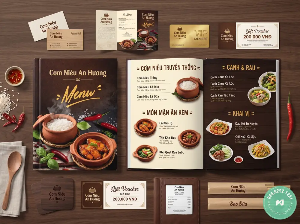 Với Cơm Niêu An Hương, hình ảnh chiếc niêu mộc mạc và font chữ mềm mại khơi gợi không khí gia đình Việt ấm cúng. Bộ nhận diện sử dụng menu bìa cứng bồi carton in màu sắc nét, sinh động, dễ dàng kích thích vị giác. Các vật dụng đi kèm như kẹp bill da nhỏ gọn, lót ly gỗ vuông bo góc và bao đũa giấy kraft mang lại cảm giác thân thiện, gần gũi. Thẻ VIP vàng gold, brochure gập 3, namecard và gift voucher giúp nhà hàng ghi điểm tuyệt đối trong việc giữ chân thực khách.