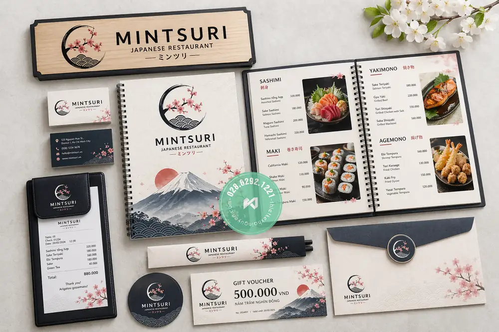 Trái ngược với I Sushi Bar, Mintsuri lại mang vẻ đẹp thanh tao, thuần khiết của Nhật Bản truyền thống với tone trắng sáng, hình ảnh núi Phú Sĩ và hoa anh đào. Khải Nguyên thiết kế menu đóng lò xo giúp thực khách dễ lật mở, đi cùng kẹp bill bìa da đen tạo sự tương phản nổi bật. Các chi tiết tinh tế như bảng tên gỗ sáng màu, bao đũa và lót ly điểm xuyết họa tiết hoa đào, cùng với bao thư có nắp gài logo, namecard và gift voucher tạo nên một không gian ẩm thực nhẹ nhàng, thư thái.