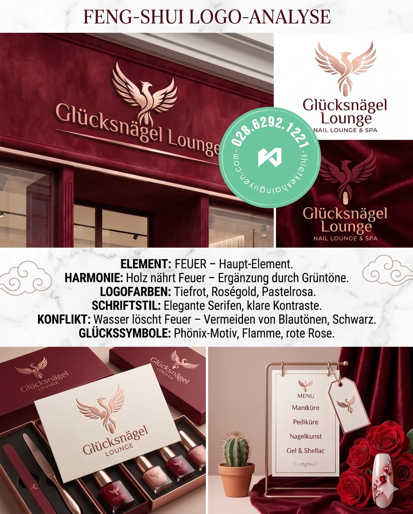 Beschreibung: Das Logo für die “Glücksnägel Lounge” wurde speziell für Inhaber mit dem Element Feuer entworfen. Das zentrale Glückssymbol ist ein eleganter, aufsteigender Phönix, der in Kombination mit Flammenmotiven für Neuanfang und strahlende Energie steht. Die Logofarben Tiefrot, Roségold und Pastellrosa wecken Leidenschaft und Dynamik. Gemäß der Feng-Shui-Harmonie (“Holz nährt Feuer”) können diese warmen Töne ideal durch dezente Grüntöne in der Studioeinrichtung ergänzt werden. Konfliktfarben wie Blau und Schwarz (Element Wasser löscht Feuer) wurden strikt vermieden. Der elegante Serifenschriftstil mit klaren Kontrasten unterstreicht den luxuriösen Spa-Charakter.