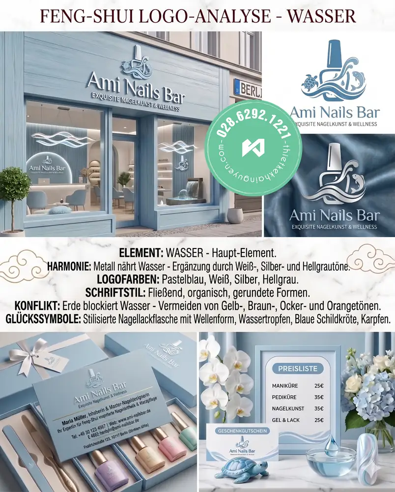Beschreibung: Die “Ami Nails Bar” nutzt die beruhigende, fließende Energie des Elements Wasser. Das Design kombiniert geschickt eine Nagellackflasche mit sanften Wellenformen und maritimen Glückssymbolen wie einer kleinen Schildkröte (für Langlebigkeit) und einem Karpfen (für Reichtum). Pastellblau, Weiß, Silber und Hellgrau dominieren die frische Farbwelt. Diese Farben fließen organisch ineinander, unterstützt durch eine weiche, gerundete Schriftart. Da Metall das Wasser nährt, ergänzen Silber- und Weißtöne das Konzept perfekt. Erdige Töne (Gelb, Braun, Ocker) wurden vermieden, da die Erde den freien Fluss des Wassers blockieren würde.