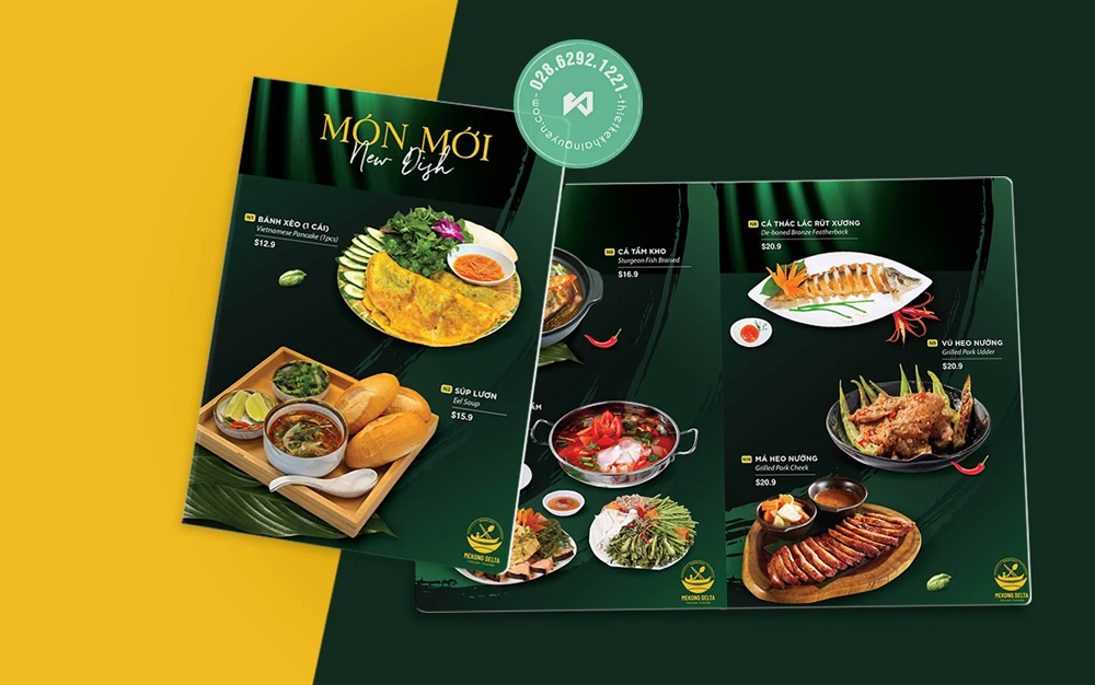 Điểm sáng của mẫu Menu A3 gập đôi nhà hàng Mekong Delta nằm ở quy cách in trên phôi nhựa PVC kích thước A3 trải phẳng (29.7 x 42 cm), sau đó cấn một đường tinh tế để gập lại thành cuốn A4 nhỏ gọn. Chất liệu nhựa cứng cáp kết hợp lớp màng bóng giúp menu chống nước 100% và màu món ăn đẹp. Về thiết kế, tone nền xanh đen (dark green) cực kỳ sang trọng đã làm nền tảng hoàn hảo để tôn lên màu sắc rực rỡ của các món đặc sản miền Tây như bánh xèo hay cá thác lác rút xương.