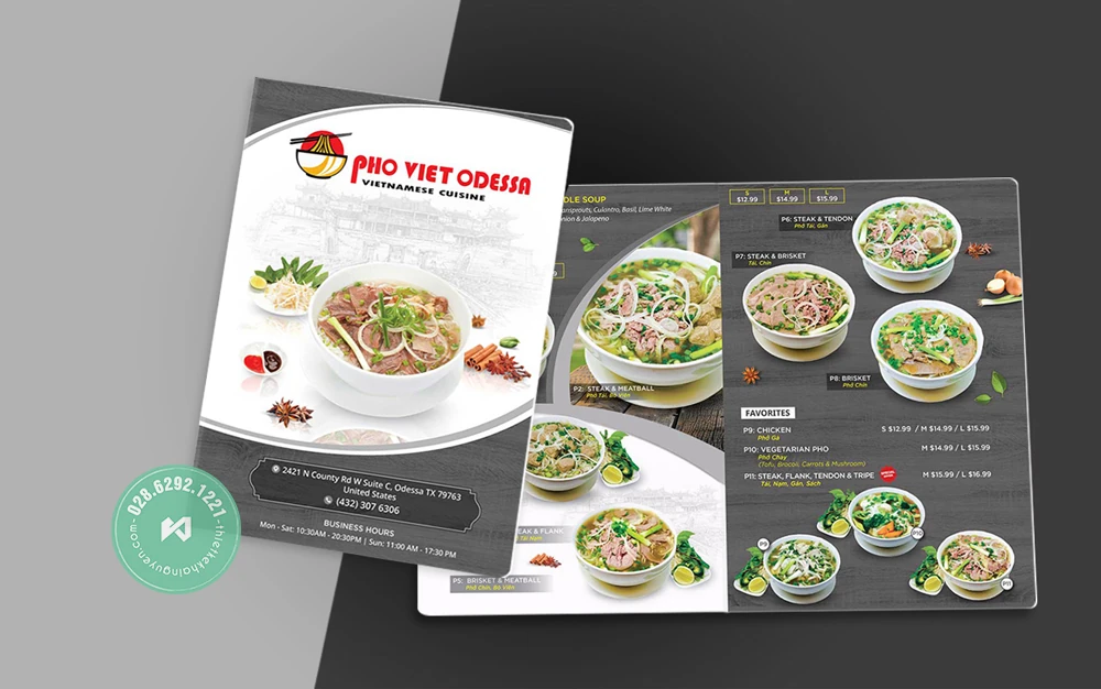 Mẫu Menu bảng A3 Nhà Hàng, Quán Ăn của Pho Viet Odessa khai thác triệt để tính năng lau chùi dễ dàng của nhựa PVC đặc, đập tan nỗi lo dính vệt nước lẩu hay dầu mỡ thường thấy ở các quán phở. Mẫu in menu nhà hàng Phở này, cũng sử dụng form nhựa dẻo dai khổ A3 gập đôi giúp nhân viên thao tác nhanh chóng. Thiết kế sử dụng nền xám xi măng mộc mạc mang hơi hướng phương Tây, làm nổi bật hình ảnh những tô phở truyền thống được tách nền tròn trịa, kết hợp mô tả tiếng Anh chuyên nghiệp phục vụ khách quốc tế.