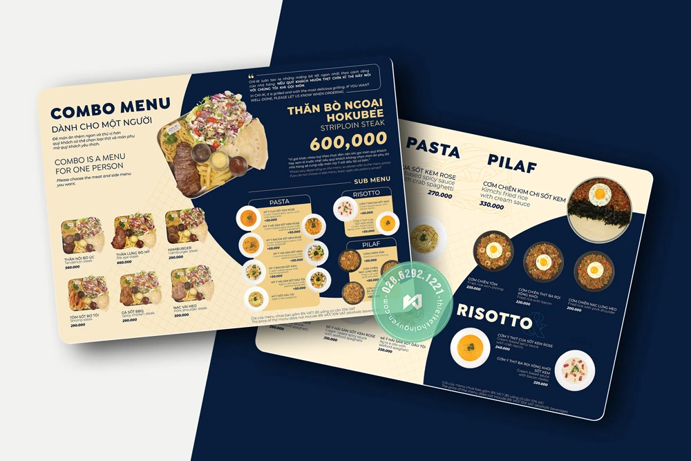 Còn về mẫu menu nhà hàng CHIIK, nó được in trên phôi nhựa dày dặn chuẩn kích thước A3 (29.7 x 42 cm). Về cơ bản kiểu in menu nhà hàng Âu dạng combo đơn giản này mang lại cảm giác cầm rất đầm tay và cao cấp. Lớp màng laminate phủ bên ngoài kết hợp cùng tone nền xanh navy thanh lịch giúp các set đồ Âu như Steak hay Pasta toát lên vẻ sang trọng, tinh tế dưới ánh đèn nhà hàng.