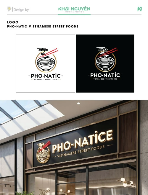 Để truyền tải đúng tinh thần này, biểu tượng tô phở truyền thống được đội ngũ Khải Nguyên thiết kế bằng những đường nét line-art hiện đại, mạch lạc và tối giản hóa các chi tiết rườm rà. Điểm nhấn thị giác đắt giá nhất nằm ở đôi đũa đỏ vắt ngang đầy mạnh mẽ, kết hợp cùng những dải khói cách điệu lượn sóng, vừa tạo chiều sâu cho logo vừa khơi gợi hương vị nóng hổi, hấp dẫn của món ăn.